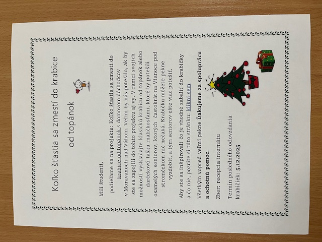 Z iniciatívy žiakov Školského parlamentu sa konala aj tento rok zbierka projektu "Koľko šťastia sa zmestí do krabice od topánok". Žiaci priniesli svoje krabice, ktoré naplnili sladkosťami, čajom, kávou, krížovkami, sviečkami či inými drobnosťami. Krabice potešia seniorov Domova dôchodcov v Moravanoch nad Váhom.