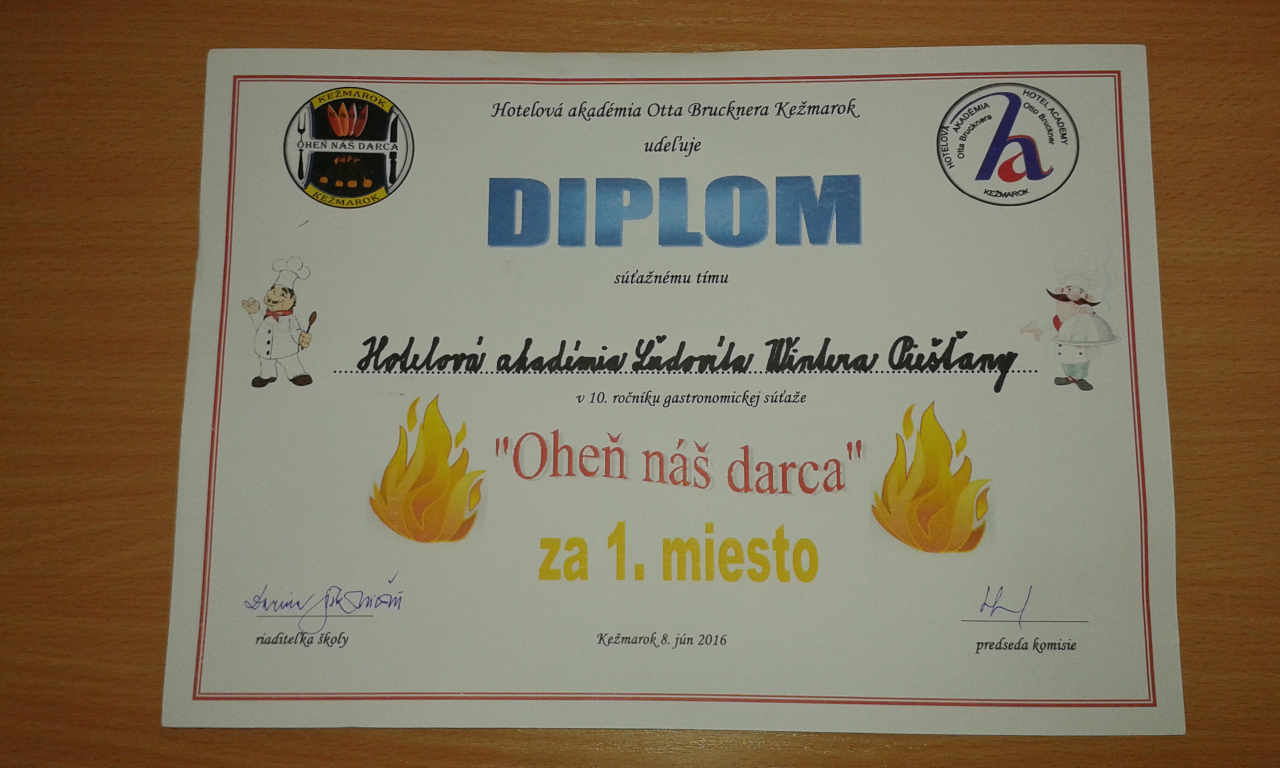 7. a 8. júna sa v Kežmarku konala celoslovenská gastronomická súťaž Oheň náš darca, na ktorej získali žiaci našej školy 1. miesto. Za kuchárov sa súťaže zúčastnili: A. Lukáčová z 2. B a B. Maliková zo 4. B. Servis jedál zabezpečoval D. Kondrc z 2. B. Za krásne umiestnenie a reprezentáciu školy ďakujeme.