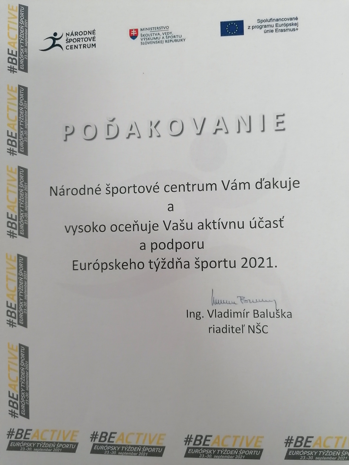 Naša škola obdržala ďakovný list za výbornú organizáciu Európskeho týždňa športu 2021. List uvádzame v plnom znení.