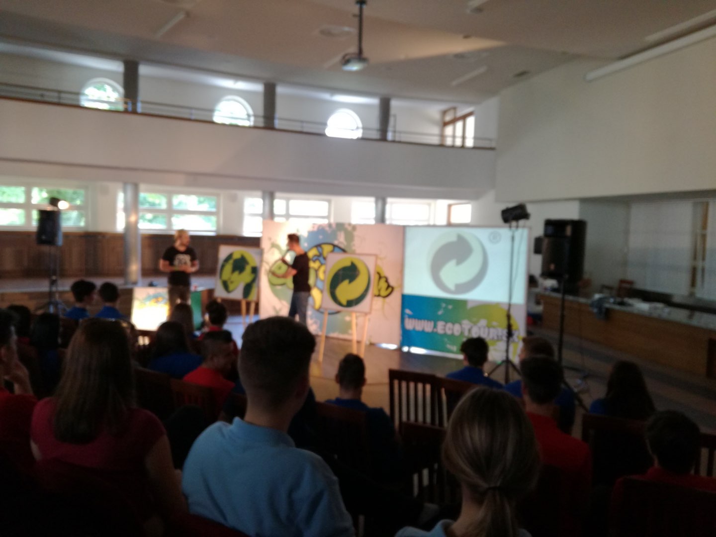 Žiaci 1. ročníka sa zúčastnili predstavenia Tomasa Puskailera a Martina Madeja ECO TOUR. Hravou formou sa poučili o dôležitosti separovania odpadu, šetrení energiami a ochrane životného prostredia.