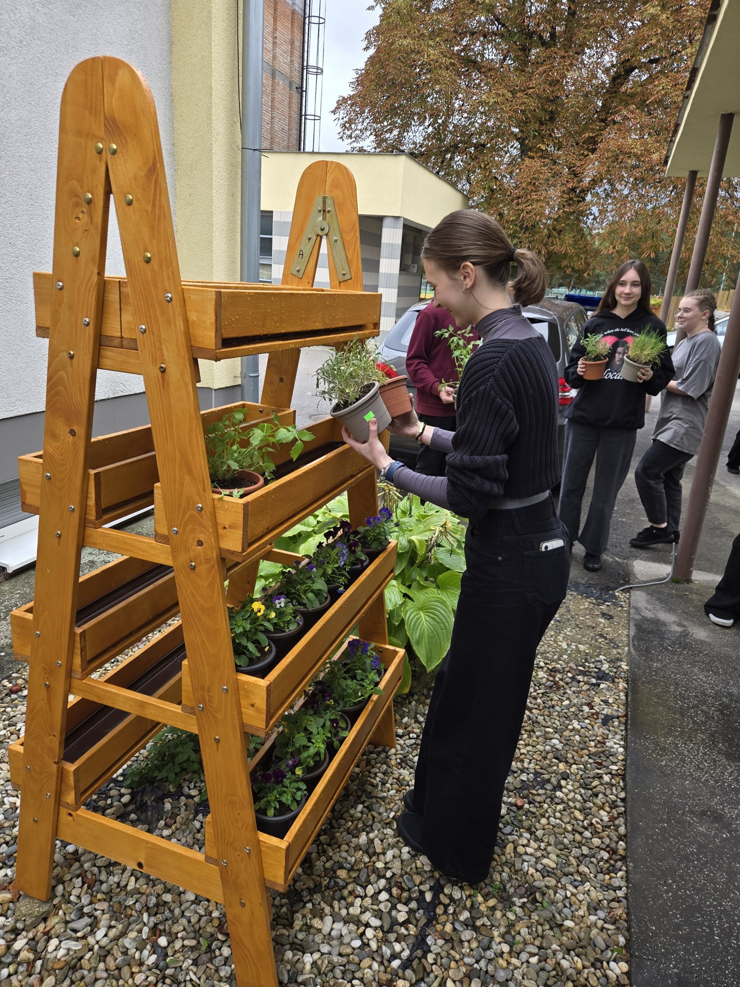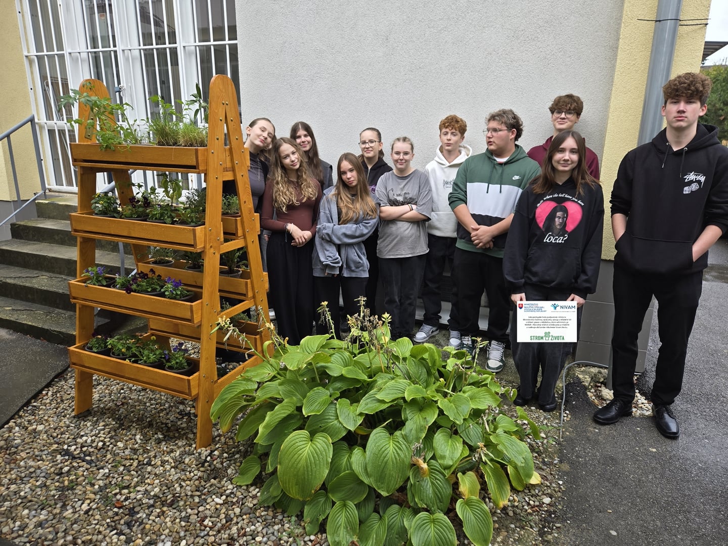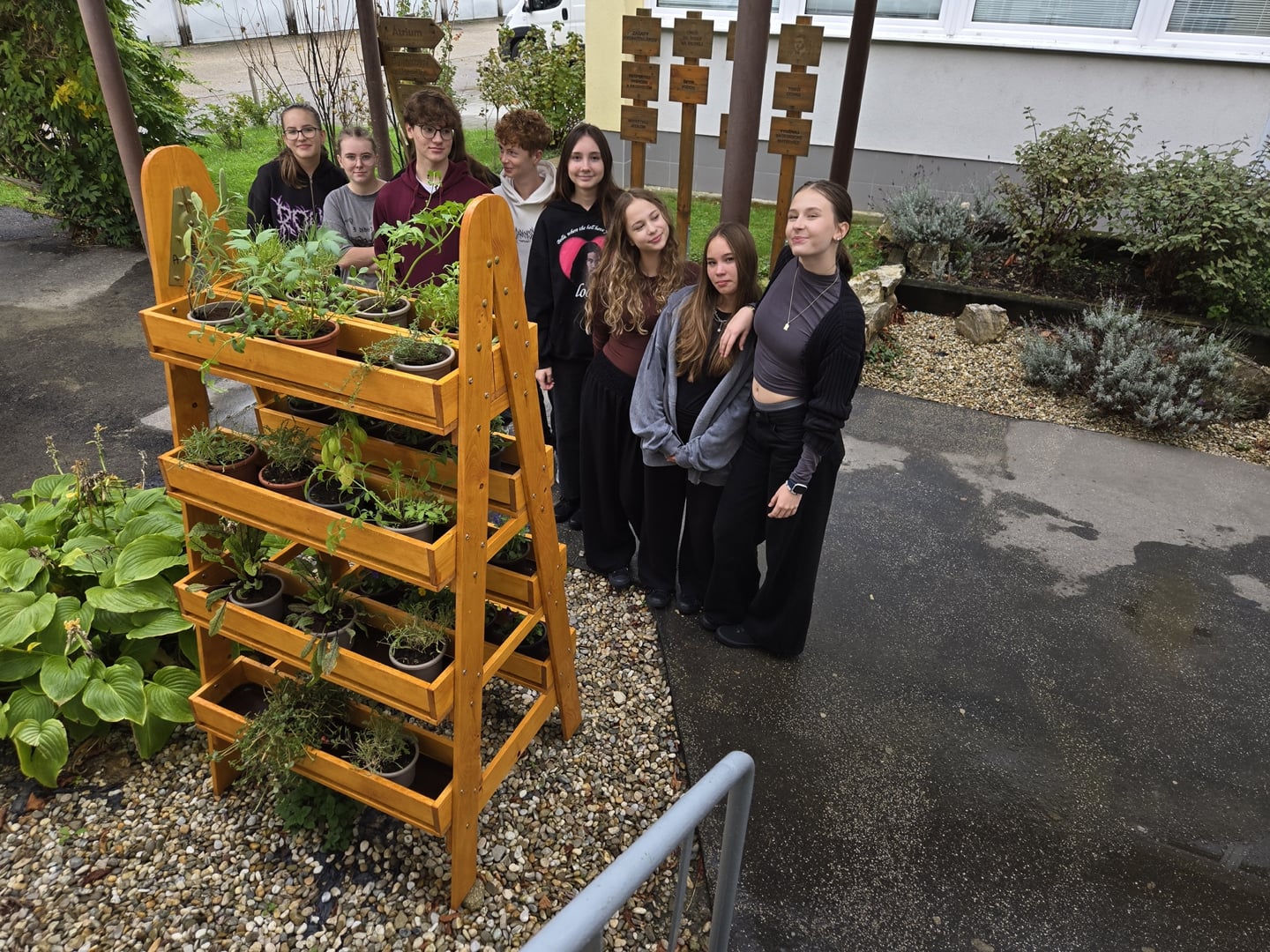Cieľom nášho projektu bola výsadba jedlých rastlín a byliniek do stojanového dreveného rebríkového kvetináča v záhradnej časti areálu školy. Výsadba prebiehala výmenou kvetináčov z pôvodných do väčších, doplnením zeminy do kvetináčov, pridali sme aj mykorhízne huby, ktoré sa napoja na korene sadených byliniek a jedlých rastliniek. Mikorhízne huby budú postupne rásť, čerpať živiny z pôdy a podporovať rastlinky počas ich celého života. Nasledovalo premiestnenie byliniek do dreveného rebríkového kvetináča a finálna zálievka. Vysadili sme tieto bylinky - kôpor, byzalku, kari, saturajku, tymián, petržlen, paštnák, medovku, pažítku, trebulku, jedlé kvietky,... Okrem úžitkovej a vzdelávacej funkcie výsadba vytvorila farebne príjemné a voňavé prostredie.