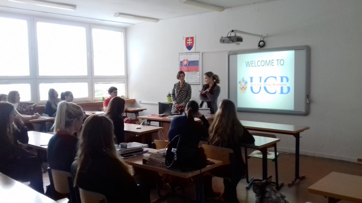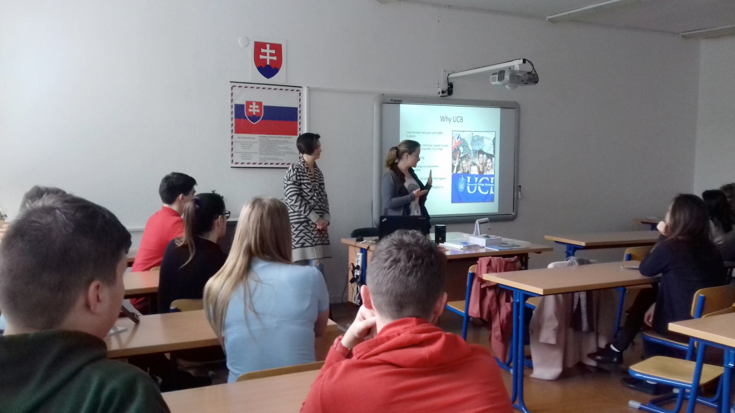 V stredu 19.4. 2017 sa 23 študentov prvého, druhého, tretieho a štvrtého ročníka zúčastnilo v poobedňajších hodinách na prednáške o štúdiu vo Veľkej Británii. Pani Lucia Lajdová, BA, ktorá zastupuje University College Birmingham na Slovensku, nám porozprávala o tom, prečo študovať práve na tejto univerzite. Prezentovala kurzy, možnosti financovania štúdia a ponúkla pomoc s organizovaním prihlásenia sa na univerzitu. Naša bývalá študentka, Kamila Kruteková, ktorá študuje na tejto univerzite prvý rok odbor Food Development and Innovation, zasa predstavila svoj pohľad na život, prácu a štúdium v Británii z&nbs p;pohľadu absolventky Hotelovej akadémie. Študenti mali zaujímavé otázky ohľadne financií, skúšok a formy štúdia. Pani profesorka, ktorá prednášku organizovala, upozornila aj na ponuku University of Derby, ktorá s našou školou spolupracuje. Ďalšie informácie majú študenti možnosť získať na stránkach univerzít a v brožúrach, ale aj od svojich vyučujúcich anglického jazyka. http://www.ucb.ac.uk/home.aspx, https://www.derby.ac.uk/ , http://applications.ucb.ac.uk/prospectus-2018/files/assets/basic-html/page-1.html.